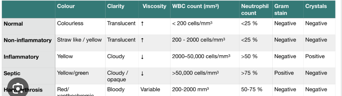 - synovial fluid appearance: often yellow/green and turbid on aspiration compared to uninfected fluid which is clear and usually colourless.