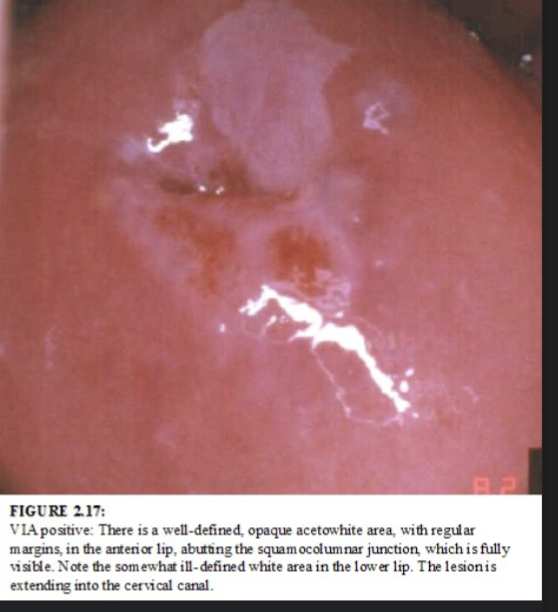 Acetic acid causes abnormal cells to appear white. This appearance is described as acetowhite. This occurs in cells with an increased nuclear to cytoplasmic ratio (more nuclear material), such as cervical intraepithelial neoplasia and cervical cancer cells.