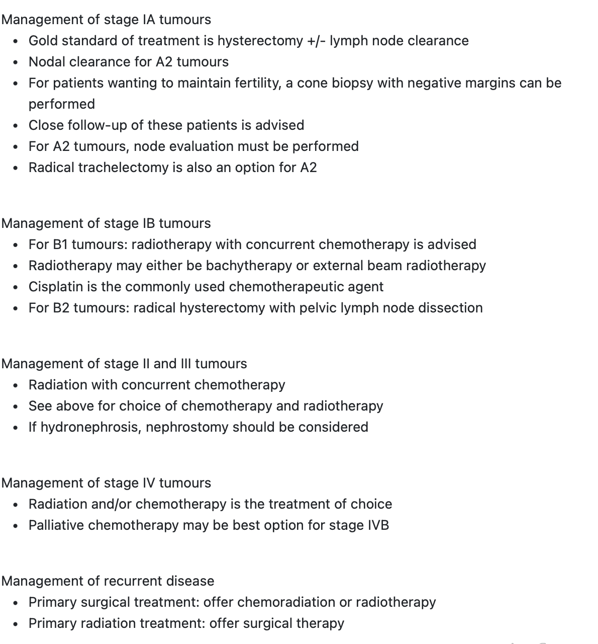 Management of cervical cancer depends on the stage and the individual situation. The usual treatments for CIN and stage 2B-4A ? [1]