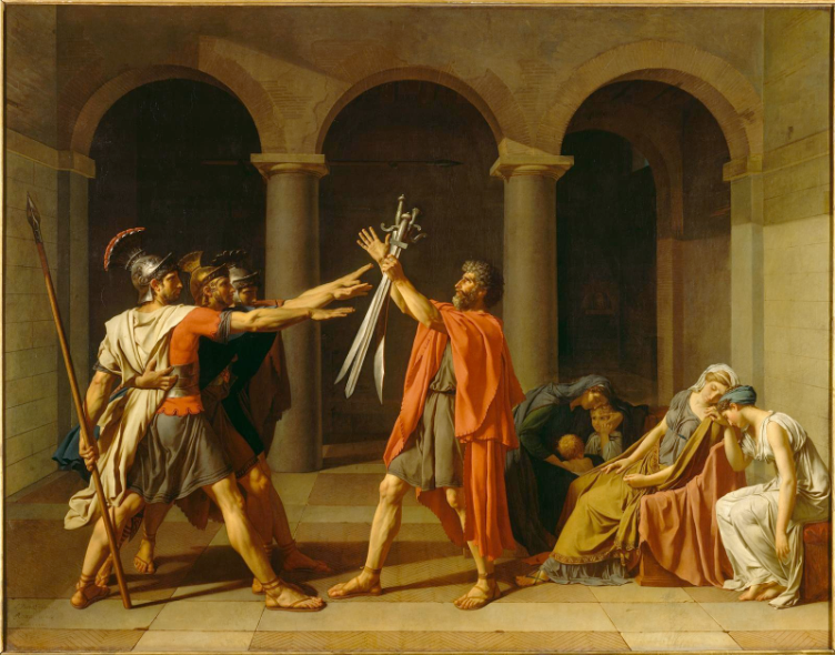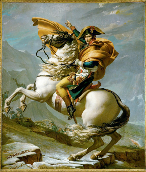 composition of painting is on a diagonal, horse, napoleon, the mountains; cape is