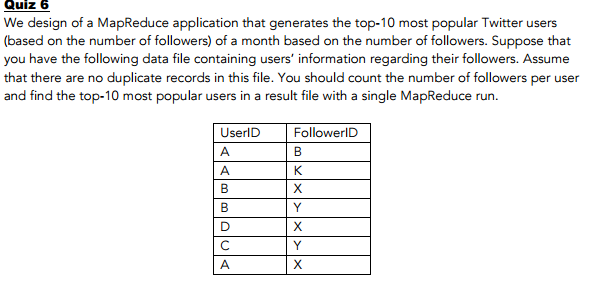 Your mapper takes one record as input. What would be the possible output pair of the map func to count num of followers per user