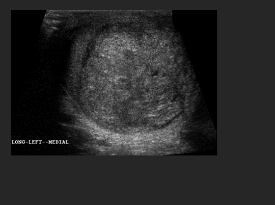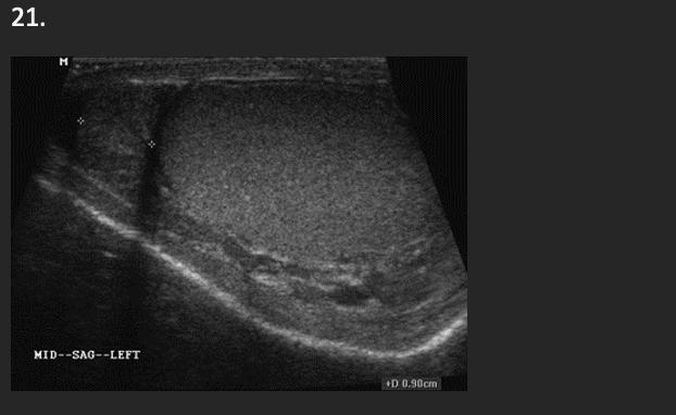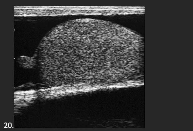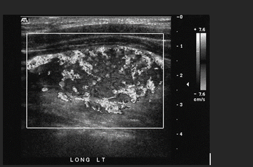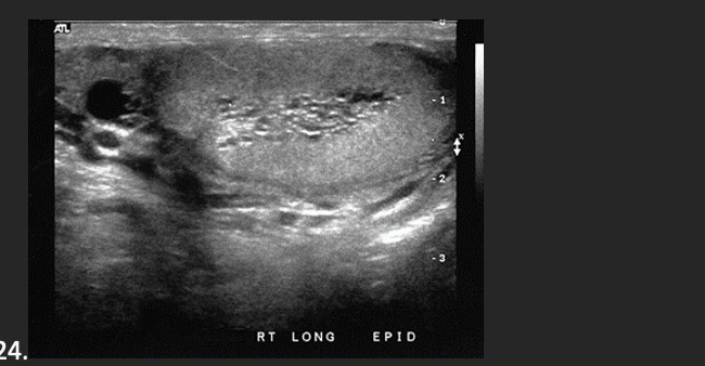 - A 30 year old patient presents with a tender scrotal mass. The sonographic finding is most suspicious for which of the following abnormalities -