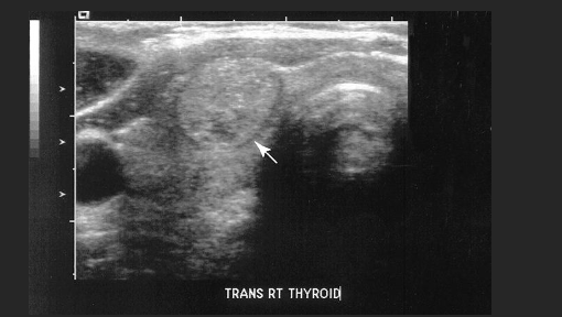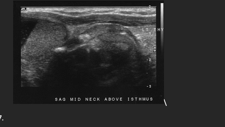 A patient presents with a palpable anterior neck mass. The patient denies any recent surgery or fever. A nonvascular complex mass is identified extending from the superior portion of the isthmus to the patients chin. On the basis of this clinical history, the sonographic findings are most suspicious for: