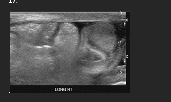 This sagittal image of the left inguinal canal an 8 month old male infant is most likely demonstrating an