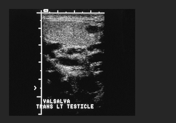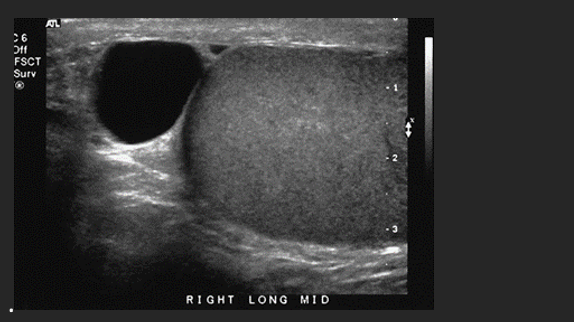 An asymptomatic patient presents with a palpable right scrotal mass discovered during a recent physical examination. The sonographic finding is most consistent with which abnormality?