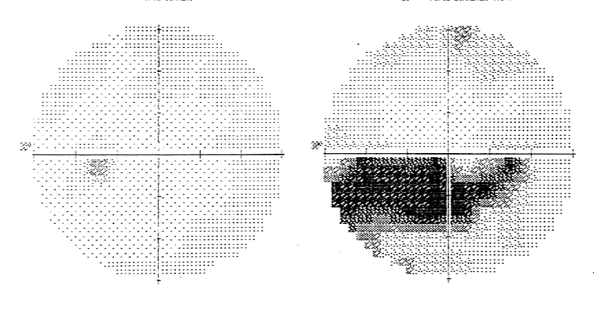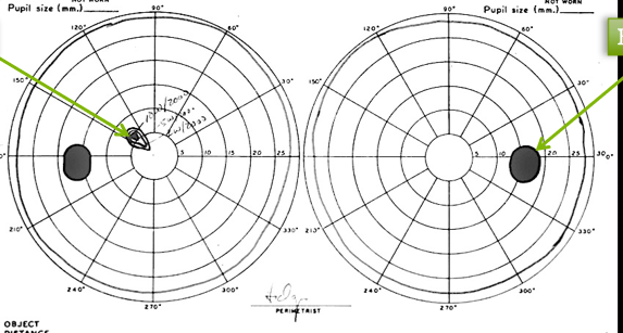 occipital lobe lesion. alsmost superimposable field defects. left occipital lobe causing right sided visual field defect.