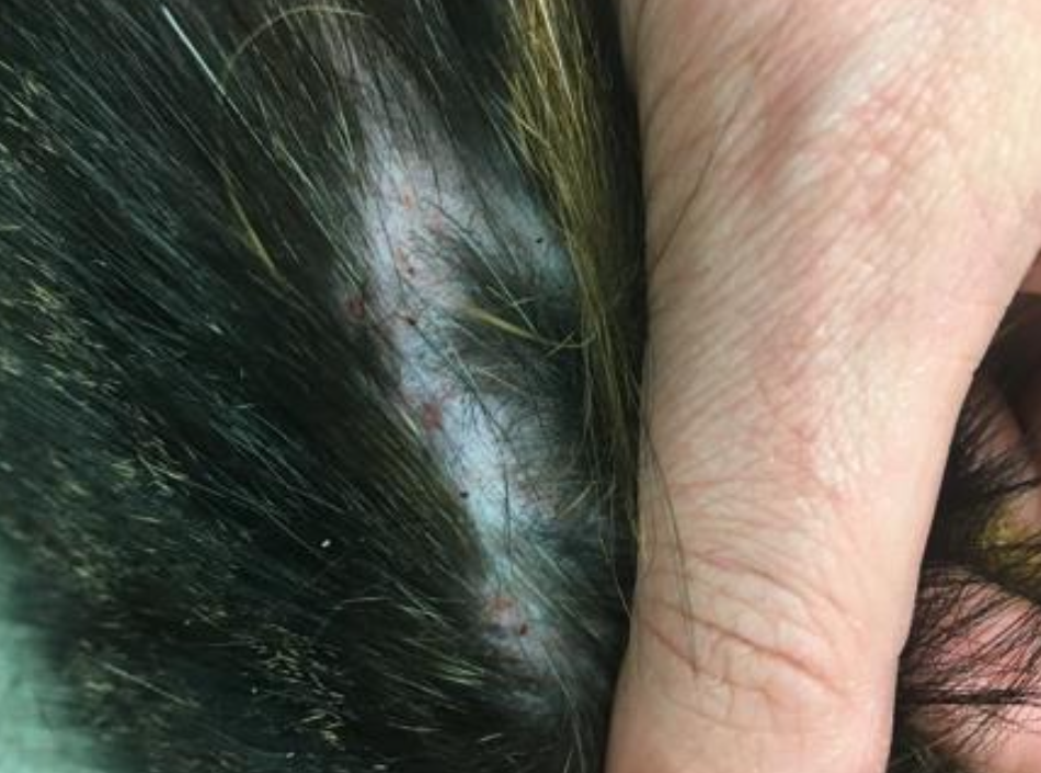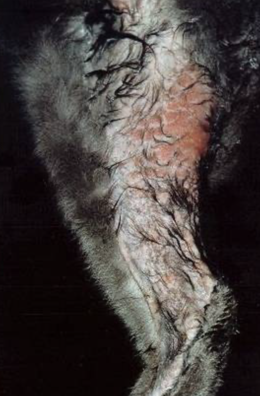 underlying skin often normal and pruritis assoc with this alopecia is often mistaken by owners as normal grooming