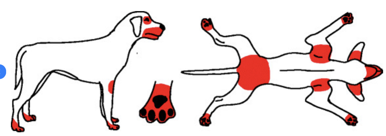 periocular, muzzle, paws, ventral metacarpal and metatarsal regions, perianal, inguinal, axillary, cubital fold