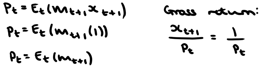 Using the standard asset pricing formula, p=E(mx), determine the price of a zero-coupon risk-free bond paying off 1 next period. What is the gross return on the bond?