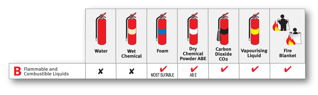Class B fires – flammable liquids: such as petrol, turpentine or paint