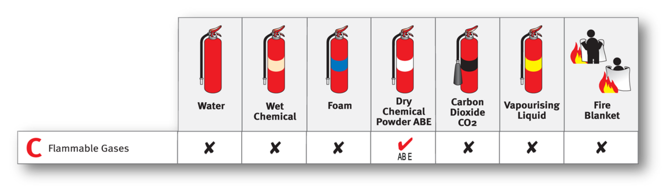 Class C fires – flammable gases: like LPG, hydrogen, butane or methane