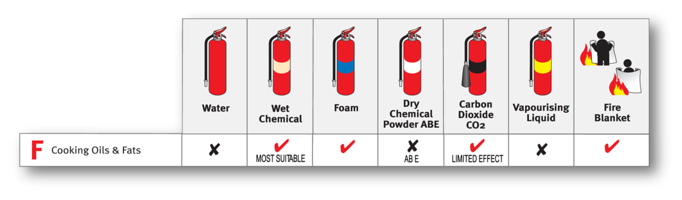 Class F fires – cooking oils: typically a chip-pan fire. Commercial kitchens. different to Class B