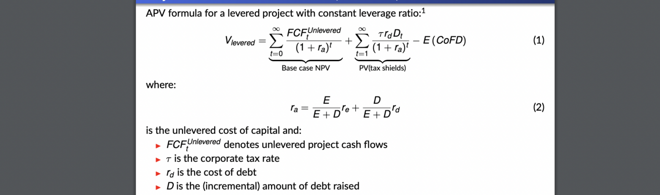 The method of writing the PV of a levered project as the sum of the PV of the unlevered project and the PV of “financing side effects” is known as