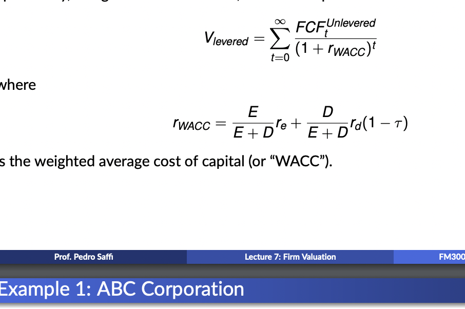 So rather than calculating the net benefits of debt using the APV, wacc forgets that and just adjusted discount rate as a way to capute the effects. Show the formula? Show the value of a levered firm using WACC.