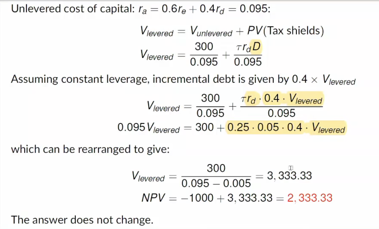 V(unlevered firm using APV) was 300/0.095 = 3157.89.