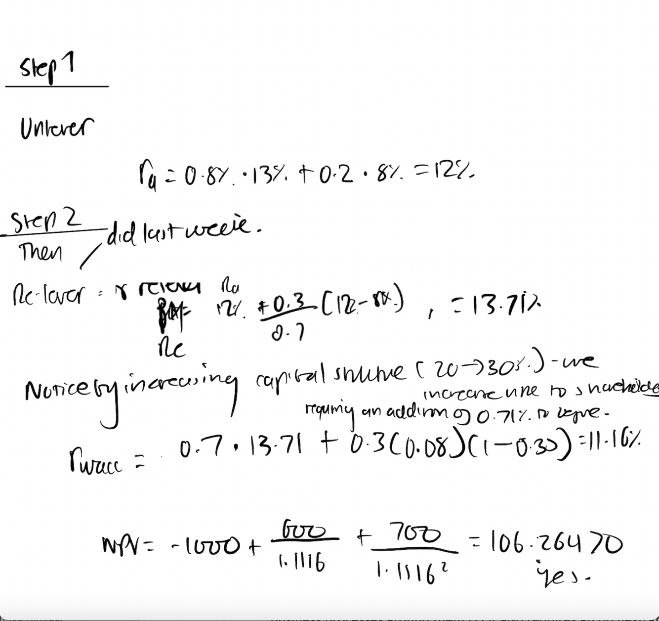 You are considering setting up a candy company. The project costs $1,000 today and generates unlevered after-tax cash flows of $600 one year from now and $700 two years from now. You plan to maintain a constant (optimal) debt-to-value ratio of 30%. At this ratio your cost of debt is 8%. The corporate tax rate is 35%. A comparable candy company maintains a constant debt-to-value ratio of 20%, cost of equity of 13%, and cost of debt of 8%. Should you undertake the project? notice anything?