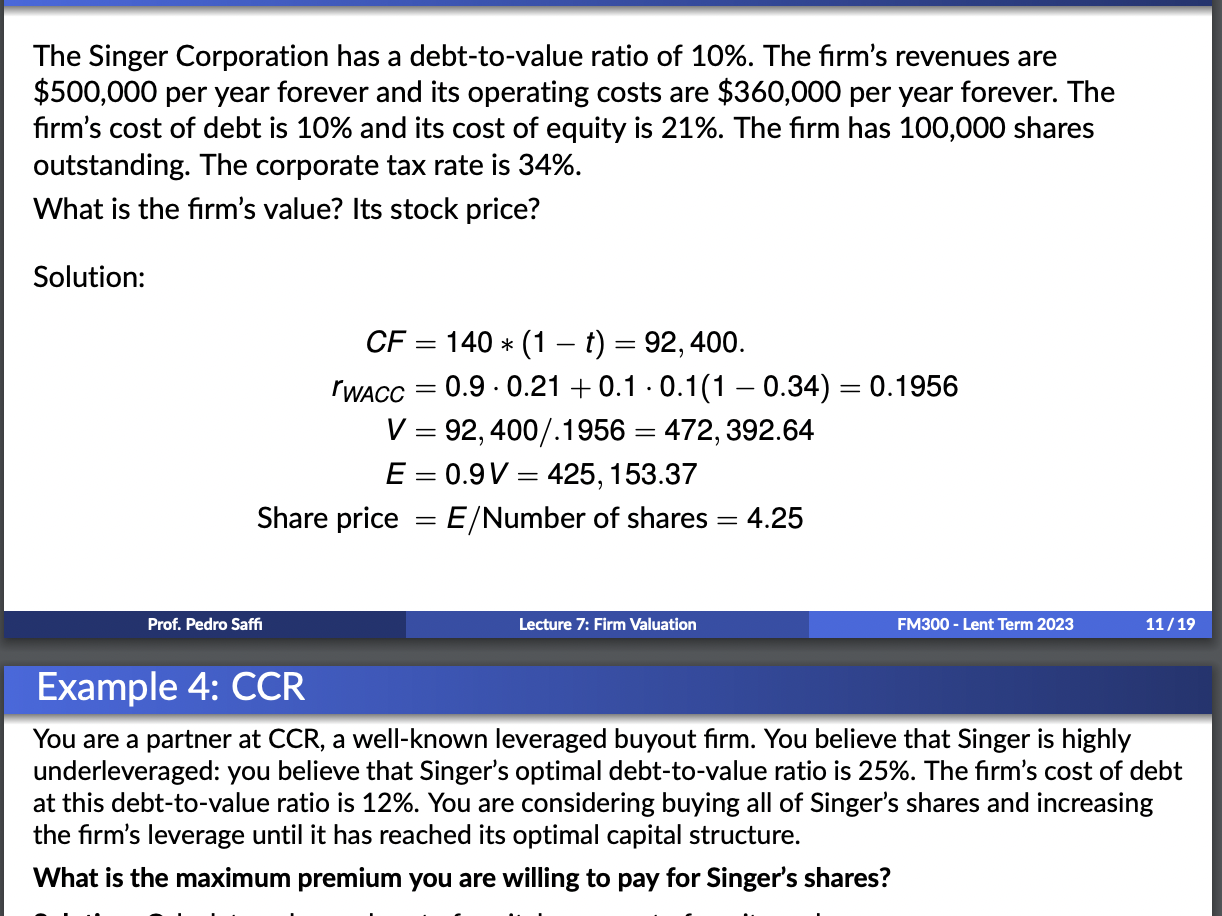 The Singer Corporation has a debt-to-value ratio of 10%. The firm’s revenues are $500,000 per year forever and its operating costs are $360,000 per year forever. The firm’s cost of debt is 10% and its cost of equity is 21%. The firm has 100,000 shares outstanding. The corporate tax rate is 34%.