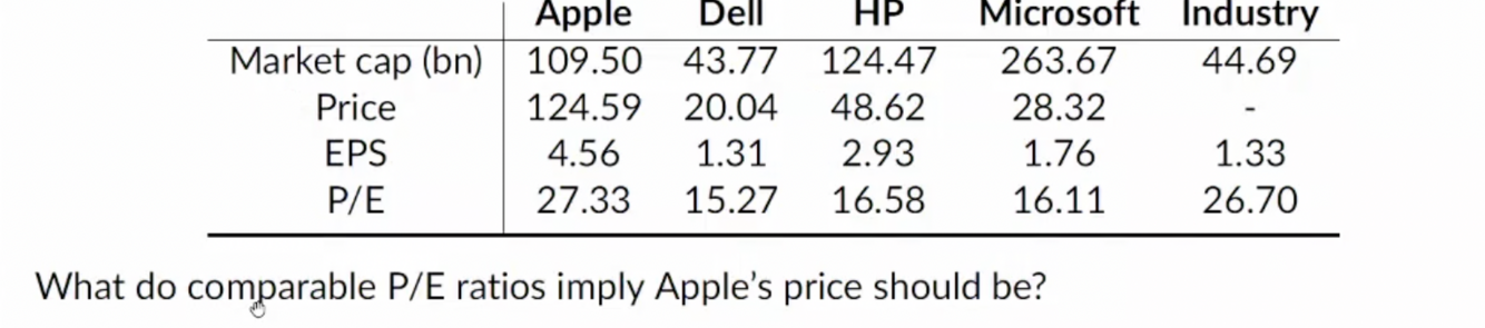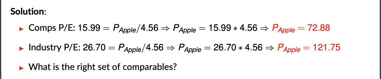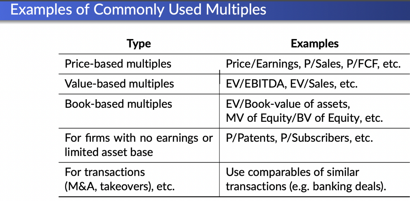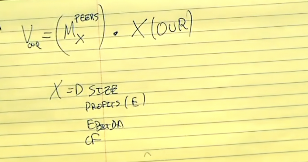 The value of our company is based on a multiple of a company x from our peers x X for our company, where x is a characteristic such as size, profit, earnings, ebitda. ( so we are trying to forecast the future based on the past)