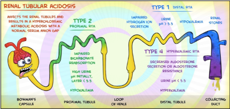 Describe the differences between renal tubular acidoses types I, II, and IV.