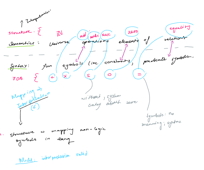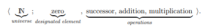 Recall, in the language of first-order arithmetic we had the following extra-logical symbols: 0 ,S , + , and ×. Thus, any structure that interprets this language must contain one designated element, one unary operation, and two binary operations.