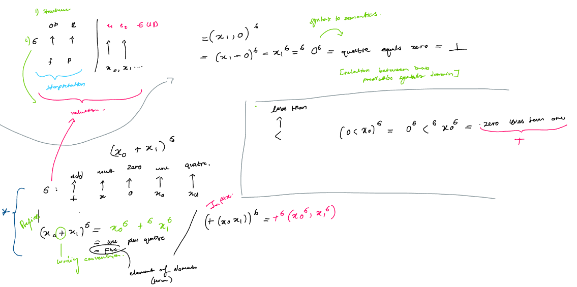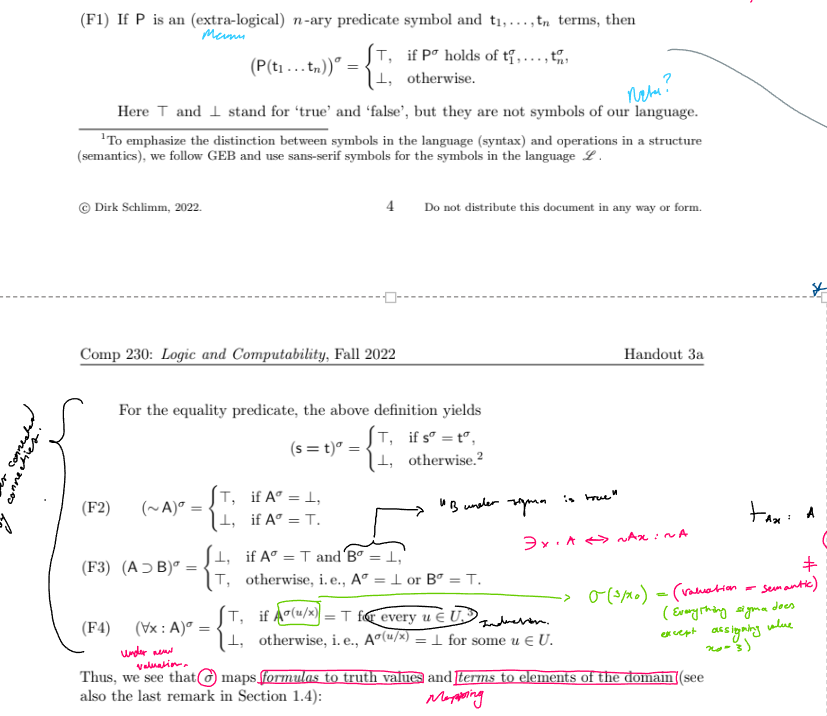 Valuation: simply an interpretation that also assigns elements from the domain to variables, where σ is the valuation in a structure with universe U.