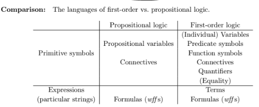 b) Formulas are like statements. They consist of predicate symbols, connectives, quantifiers.
