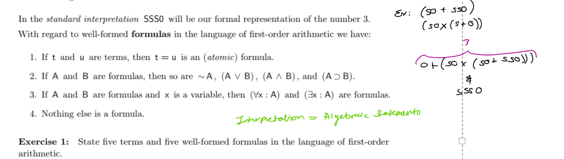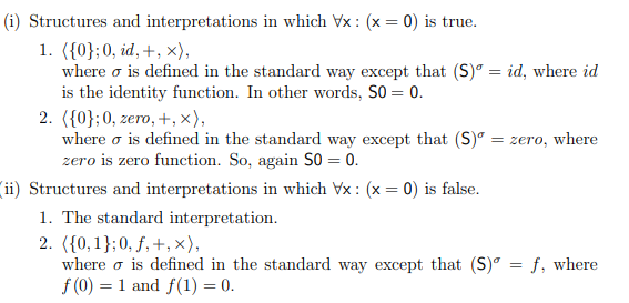 If σ is an interpretation of first-order arithmetic in hIN, 1; s, +, ×i, i. e., the structure whose domain are the natural numbers, and where 0^σ = 1, S^σ = s (successor), +^σ = +, and ×^σ = ×, what are (SS0 + SSS0 = SSSSS0)^σ and (∀x : ∼(Sx = 0))^σ?