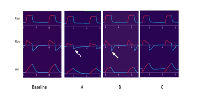expiratory flow rate, decreased tidal volume if in PCV.