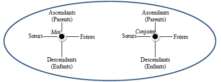 Je suis liée à mes parents, mes enfants, mes frères et sœur et mon conjoint et ses parents, frères,sœurs, enfants.