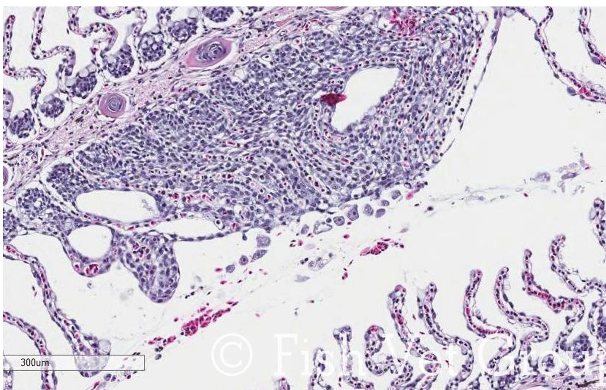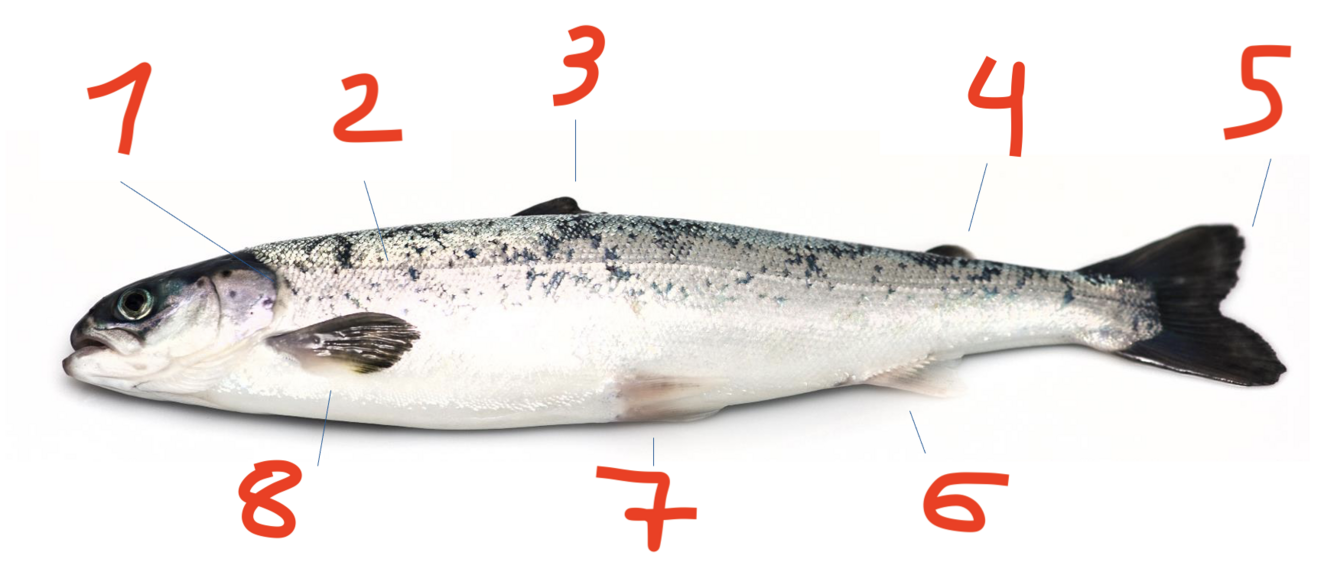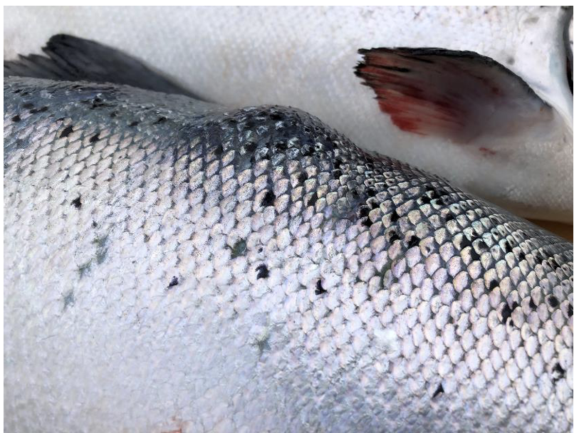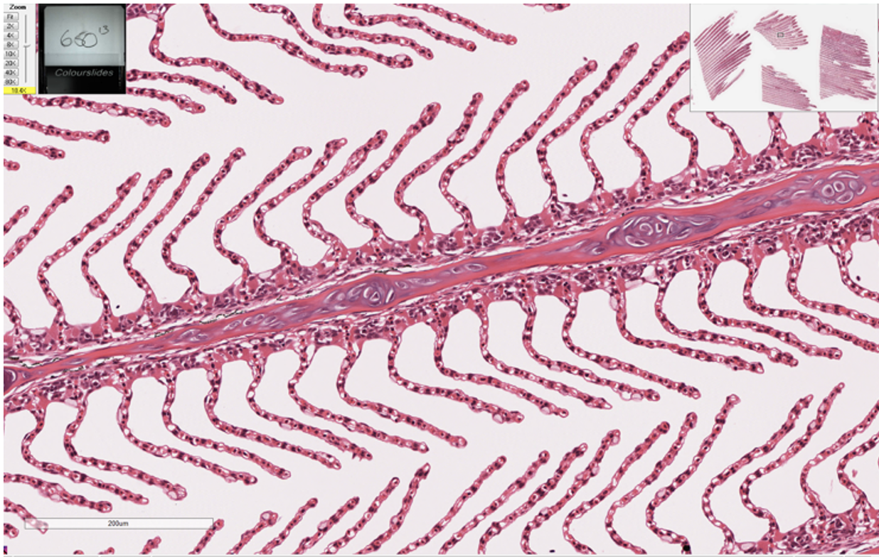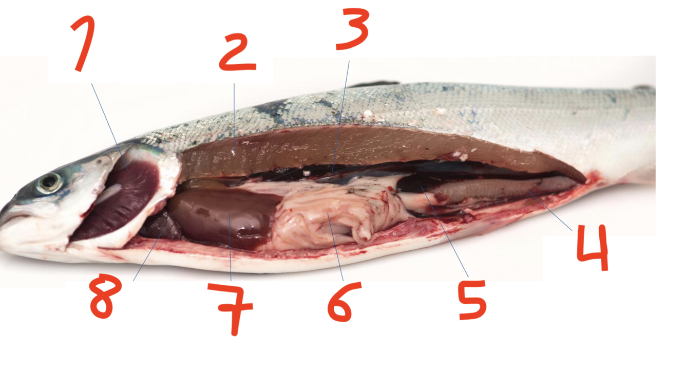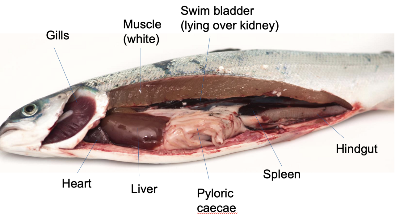 Gill, heart, liver, pyloric caecae, spleen, hindgut, kidney, skin/muscle