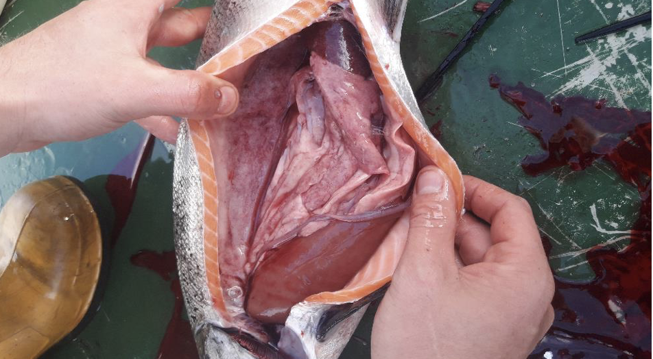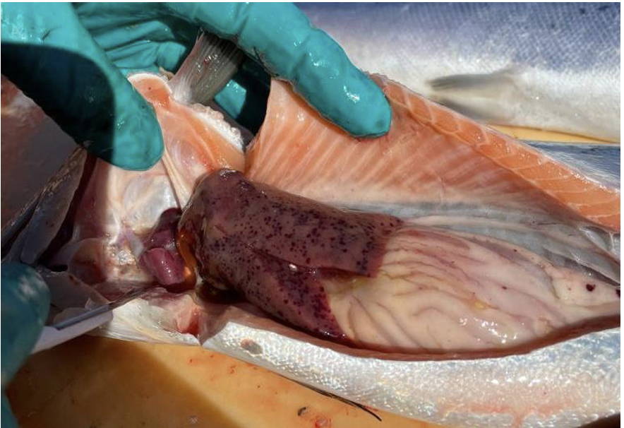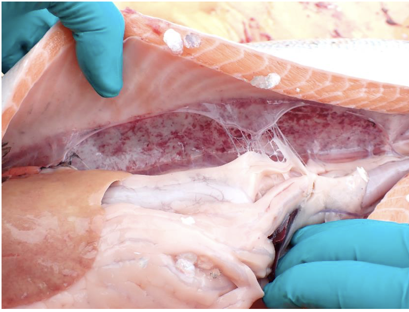 Petechial bleeding on swim bladder surface (bacterial - Aeromonas salmonicida)