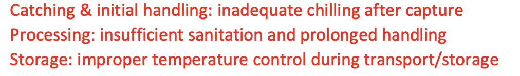 Certain fish like tuna, mackerel, and sardines naturally contain high levels of histidine, which bacteria convert to histamine under improper storage. Meat lacks such conditions.