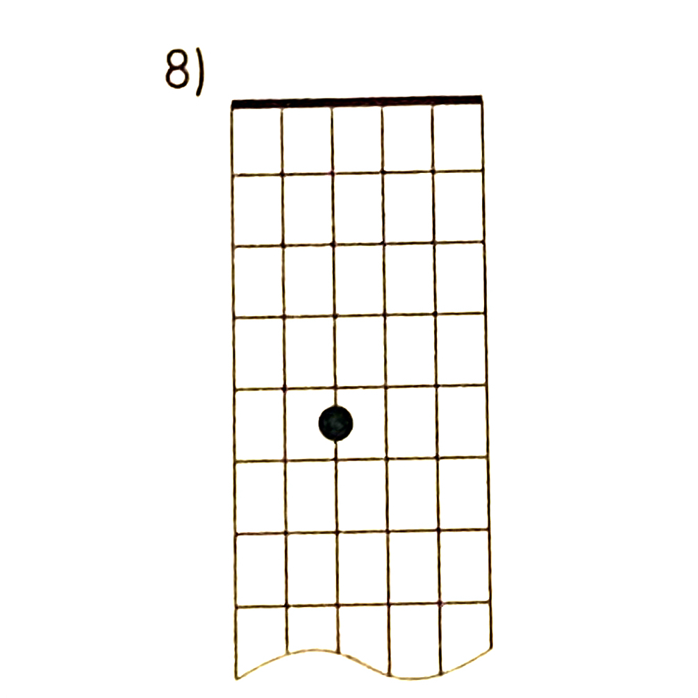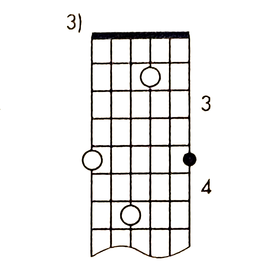 Pattern 3 has roots on the third, first and sixth strings, three frets apart and Pattern 4 has roots on the first, sixth and fourth strings, two frets apart