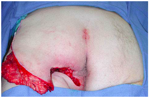 The lateral thigh flap is a versatile flap that has a thin, cutaneous skin paddle and is innervated by the lateral cutaneous nerve of the thigh. As much as 8 * 25 cm can be transferred; however, split-thickness skin grafting is required for closure at the donor site if a flap with a width of greater than 8 cm is harvested. In addition, the lateral aspect of the thigh flap can be hair-bearing, especially in men, while the dermis is characteristically thick and stiff.