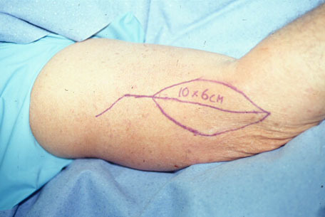 The vascular supply of the lateral arm flap is from the posterior radial collateral artery, a terminal branch of the deep brachial artery. This artery communicates distally with the ulnar artery, allowing the flap to be raised in a distally based fashion, as it was for the patient in this item. For most adult patients, a 12 × 6-cm flap can be harvested and still allow for primary donor site closure. The major extremity vessels are not disturbed with the harvest of this flap.