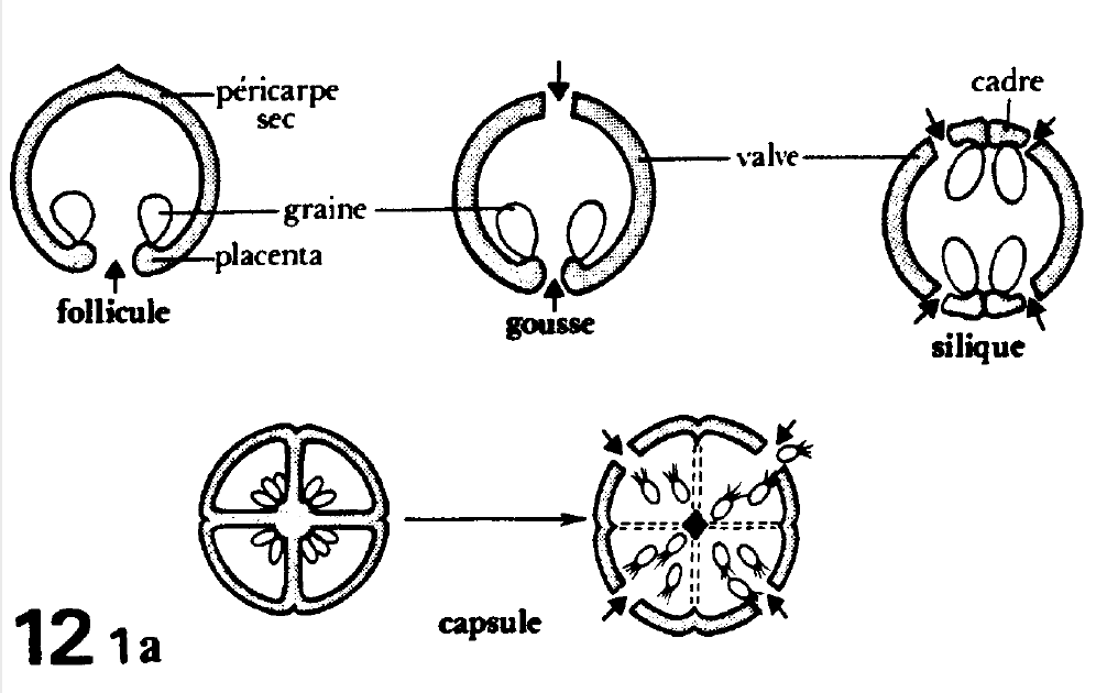 – follicule : 1 carpelle, 1 fente – gousse : 1 carpelle, 2 fentes – silique : 2 carpelles, présence d’un septum – capsule : 2 carpelles ou plus • fentes ou pores