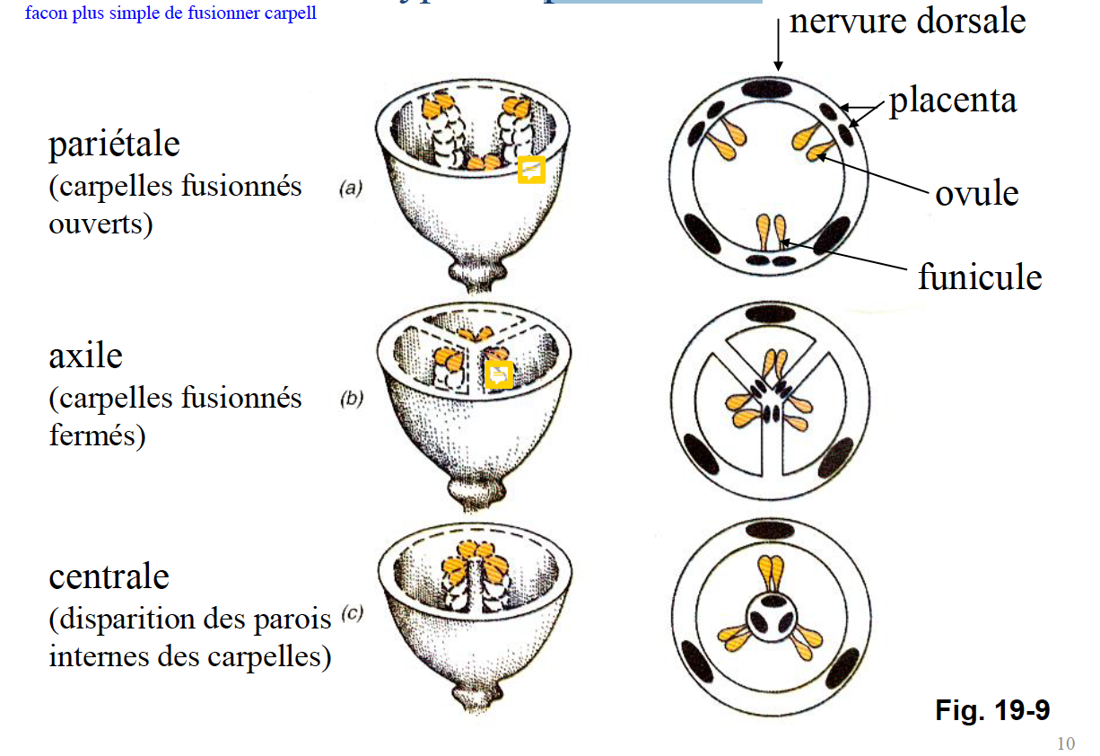– externe : ovaire (base), style (centre), stigmate (reçoit le pollen au sommet) – interne : • uniloculaire (un seul carpelle) ou • plusieurs carpelles fusionnés