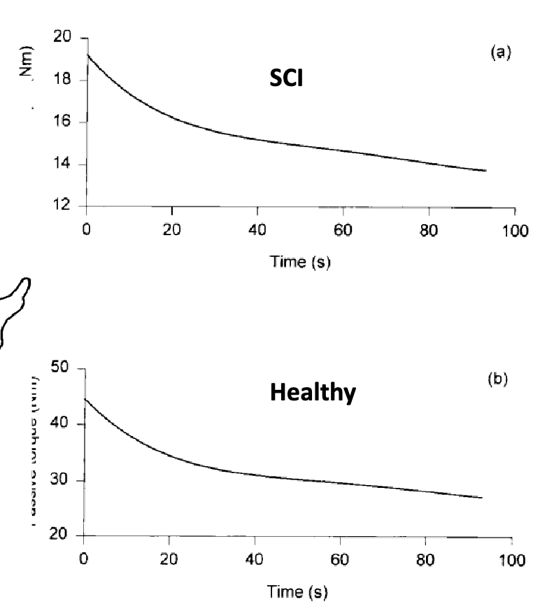 Identical responses in SCI and healthy participants suggest that decreased passive force is due to mechanical factors, not reduced muscle activity.