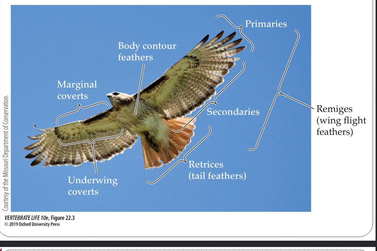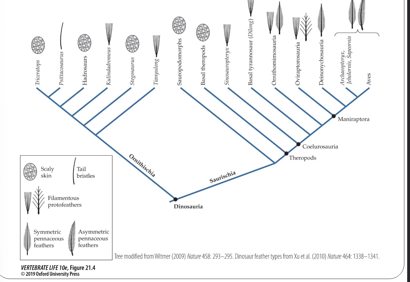 • Well developed • Asymmetrical vanes • Arrangement of flight feathers ○ Like modern birds ○ Primaries on phalanges and seconderies on radius/ulna • Arrangement of tail feathers ○ Different than modern birds • Body covering of feathers ○ Similar to modern birds • Feathers on legs