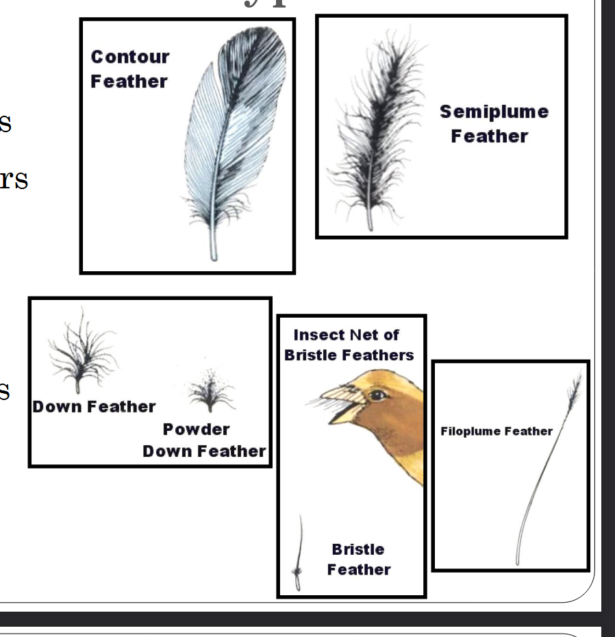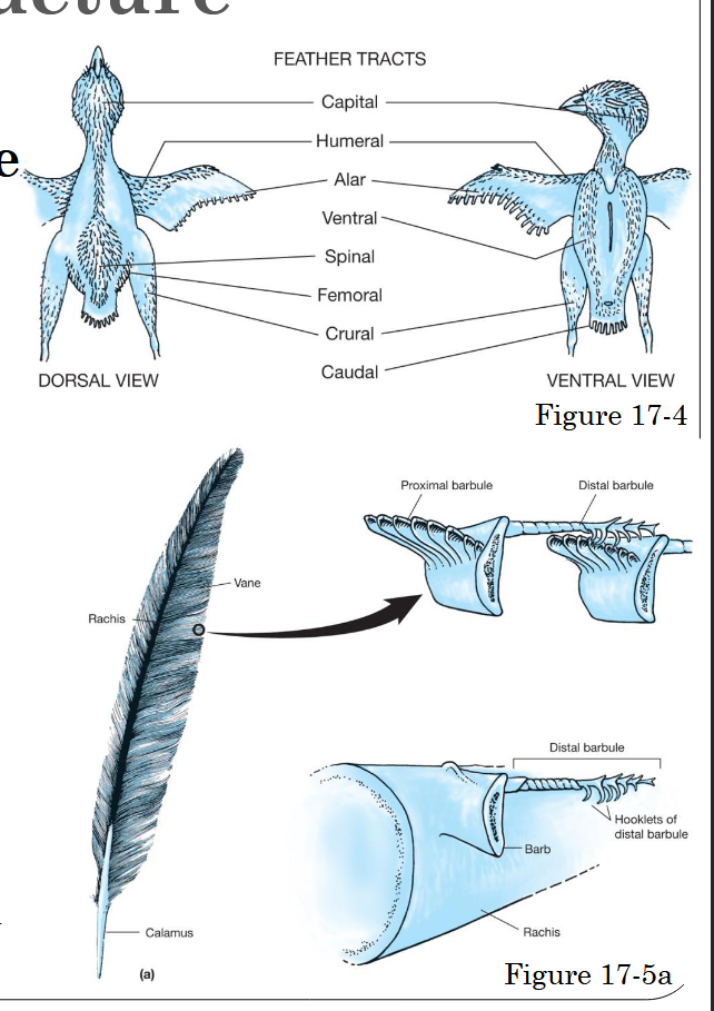 ○ Barbs are collectively called vane - more SA, serves as a blanket, windbreaker, display color, etc - resist mechanical pressure by interlocking barbs = serves as a sheath