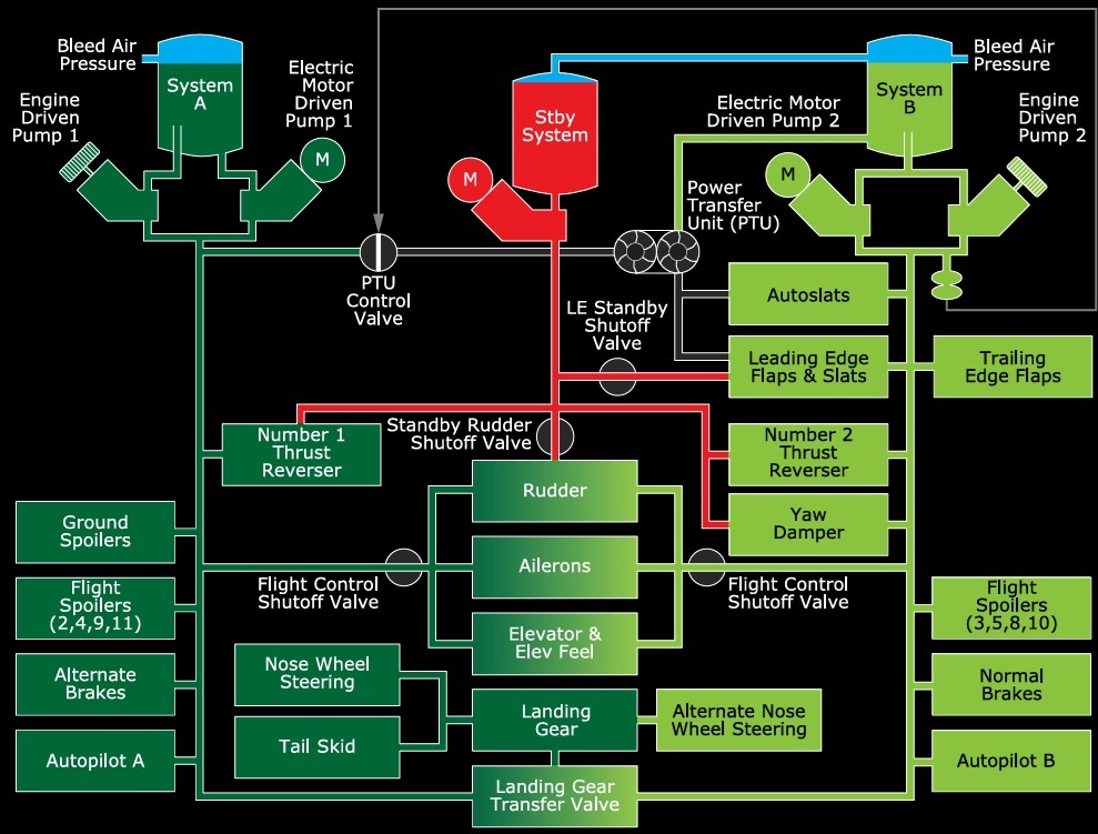 Normally, hydraulic system A and B power the flight controls redundantly; however the primary flight controls may be operated with only system A or B.