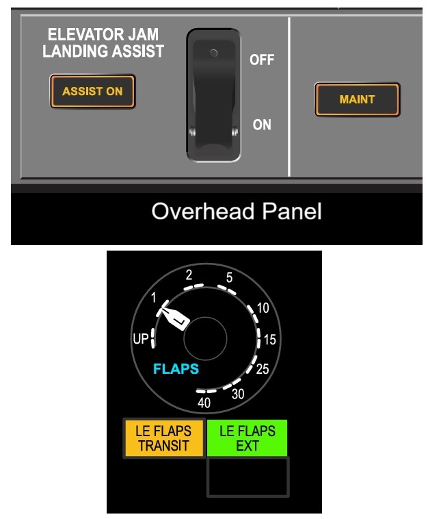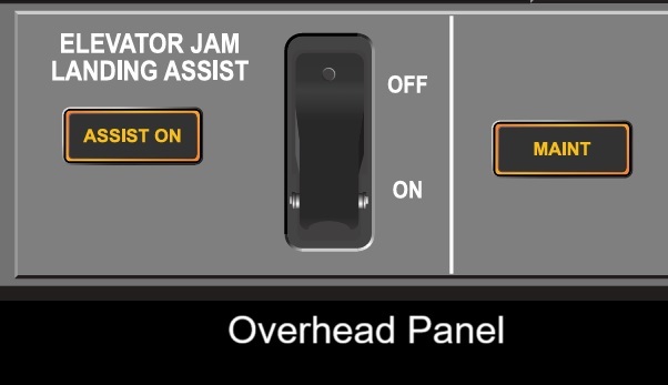 To activate the system, the ELEVATOR JAM LANDING ASSIST switch must be selected ON and the actual TE flap position must be 1 degree or greater with the autopilot disengaged.