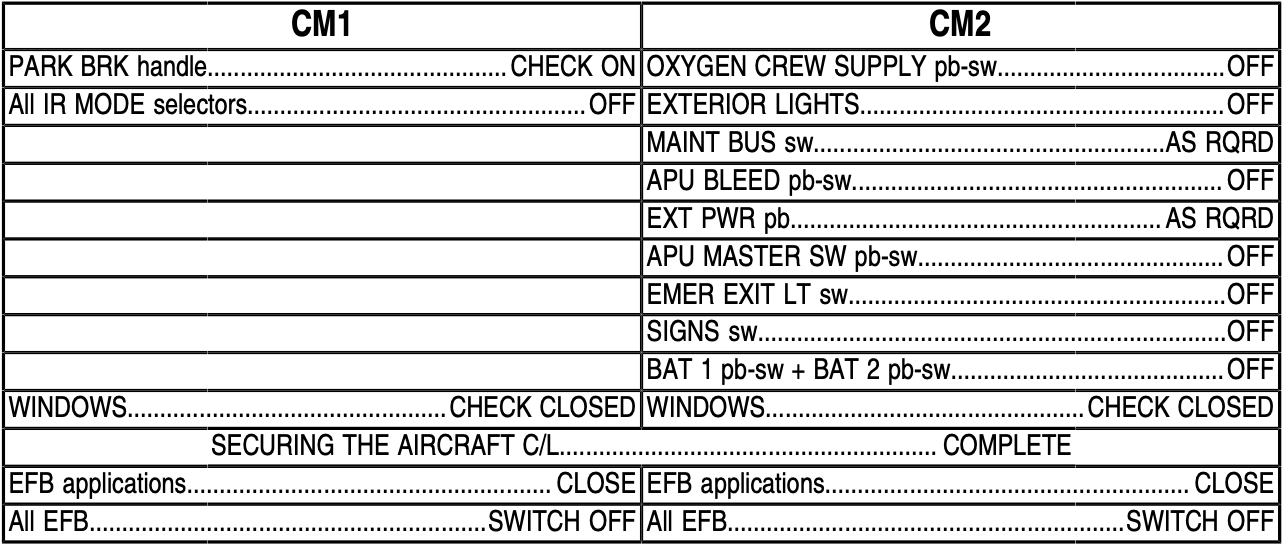 Start “ABC” when Lateral Console and Inst Panel check completed (PF performs LAND ELEV, SATUS, FOB triangle and PM checks IRS alignment using POSITION MONITOR page and checking selectors)