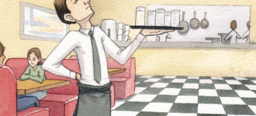 Every FRIDAY, that WAITER STANDS with his HAND on his BACK