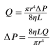 Used to describe laminar flow of incompressible fluids through a long cylindrical tube. Poiseuille’s law contains five variables: the flow rate (Q), the pressure drop between both ends of the tube (ΔP), the radius of the tube (r), the length of the tube (L), and the viscosity (η). It can be written in two equivalent forms, both of which are given below: