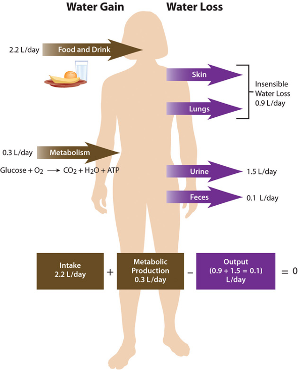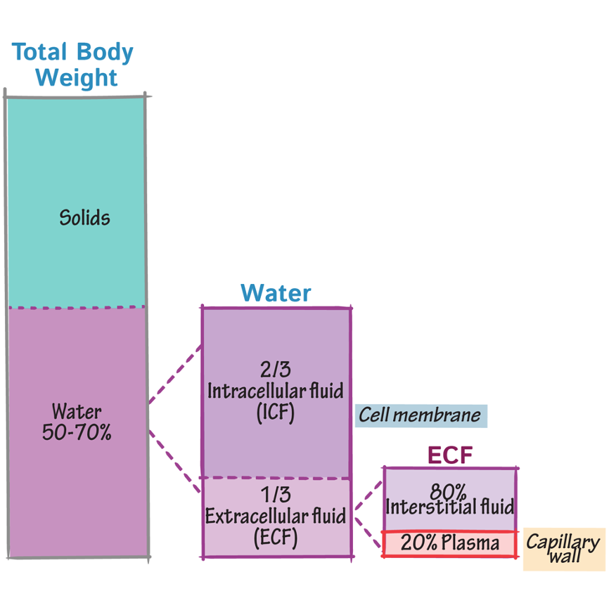 All of Na+, ~1/3rd of K+, and 1/4 of water