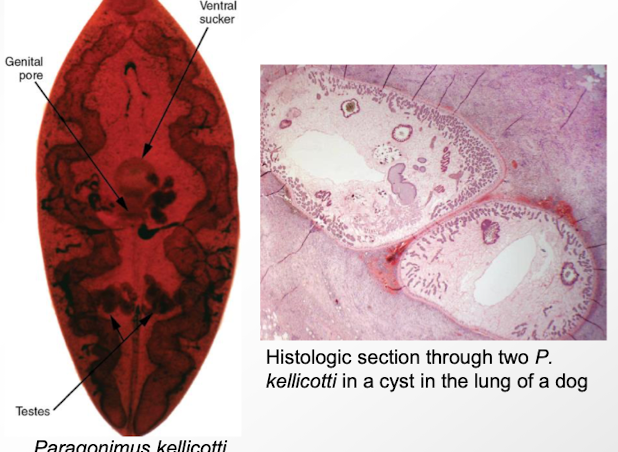 what species of adult fluke infects lungs of cats, dogs, and many wild animals?