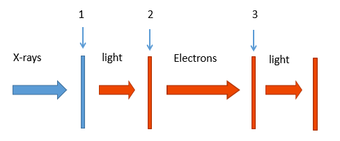 Following diagram represents the conversion process in an image intensifier used in a analogue fluoroscope.