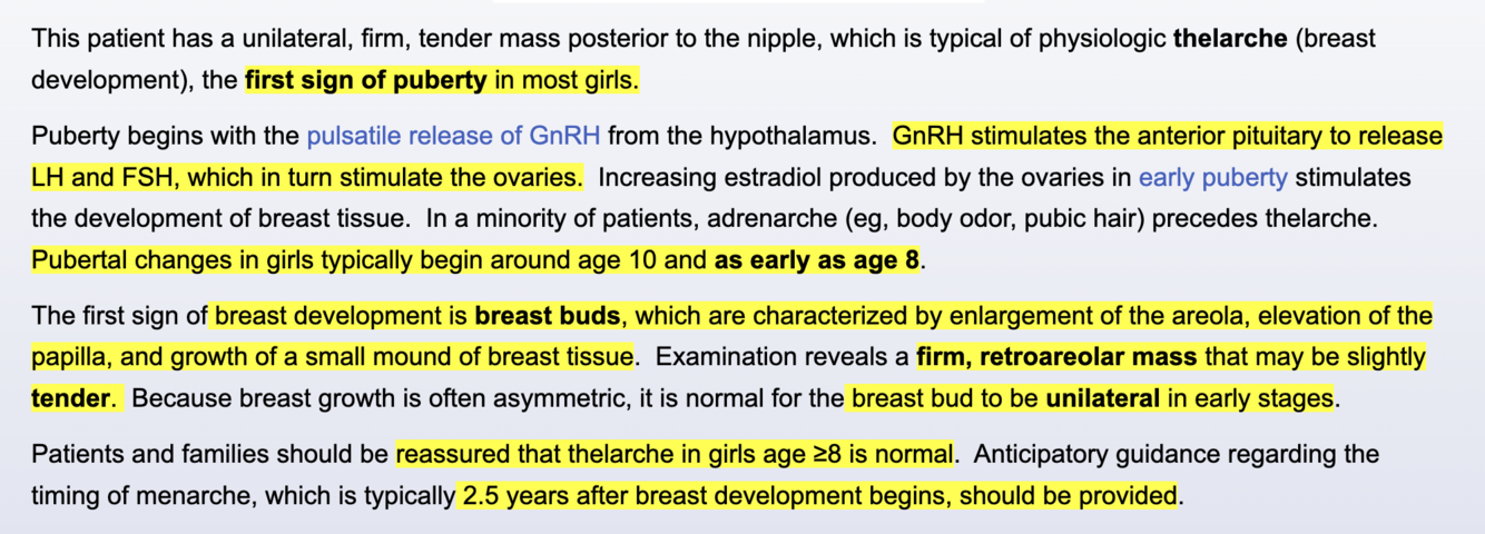 Unilateral, firm, tender mass posterior to the nipple – Thelarche (Development of breast bud)
