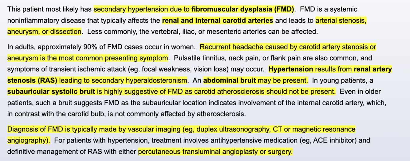 A subauricular systolic bruit is highly suggestive of FMD in any age patient